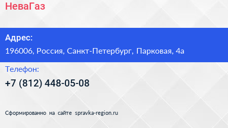 НеваГаз по адресу 196006, Россия, Санкт-Петербург, Парковая, 4а в дальнейшем Организация, размещена в следующих категориях: