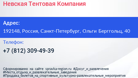 Невская Тентовая Компания по адресу 192148, Россия, Санкт-Петербург, Ольги Берггольц, 40 в дальнейшем Организация, размещена в следующих категориях: