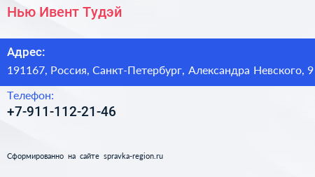 Нью Ивент Тудэй по адресу 191167, Россия, Санкт-Петербург, Александра Невского, 9 в дальнейшем Организация, размещена в следующих категориях: