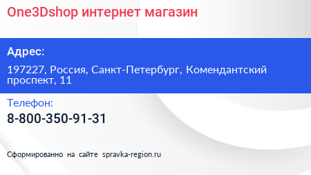 One3Dshop, интернет-магазин по адресу 197227, Россия, Санкт-Петербург, Комендантский проспект, 11 в дальнейшем Организация, размещена в следующих категориях: