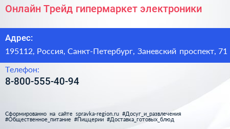 Онлайн Трейд, гипермаркет электроники по адресу 195112, Россия, Санкт-Петербург, Заневский проспект, 71 в дальнейшем Организация, размещена в следующих категориях: