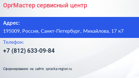 ОргМастер, сервисный центр по адресу 195009, Россия, Санкт-Петербург, Михайлова, 17 к7 в дальнейшем Организация, размещена в следующих категориях: