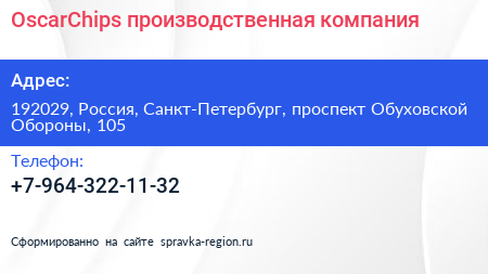 OscarChips, производственная компания по адресу 192029, Россия, Санкт-Петербург, проспект Обуховской Обороны, 105 в дальнейшем Организация, размещена в следующих категориях:
