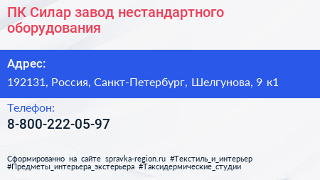 ПК Силар, завод нестандартного оборудования по адресу 192131, Россия, Санкт-Петербург, Шелгунова, 9 к1 в дальнейшем Организация, размещена в следующих категориях: