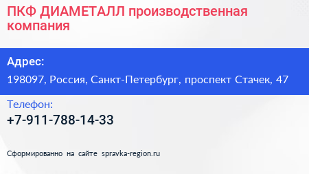 ПКФ ДИАМЕТАЛЛ, производственная компания по адресу 198097, Россия, Санкт-Петербург, проспект Стачек, 47 в дальнейшем Организация, размещена в следующих категориях: