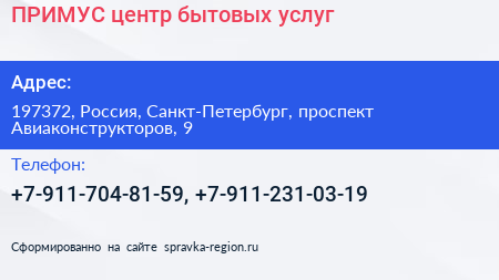 ПРИМУС, центр бытовых услуг по адресу 197372, Россия, Санкт-Петербург, проспект Авиаконструкторов, 9 в дальнейшем Организация, размещена в следующих категориях: