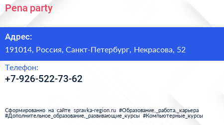 Pena-party по адресу 191014, Россия, Санкт-Петербург, Некрасова, 52 в дальнейшем Организация, размещена в следующих категориях: