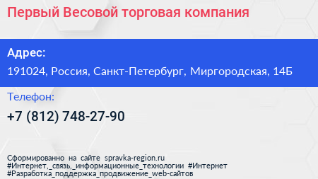 Первый Весовой, торговая компания по адресу 191024, Россия, Санкт-Петербург, Миргородская, 14Б в дальнейшем Организация, размещена в следующих категориях:
