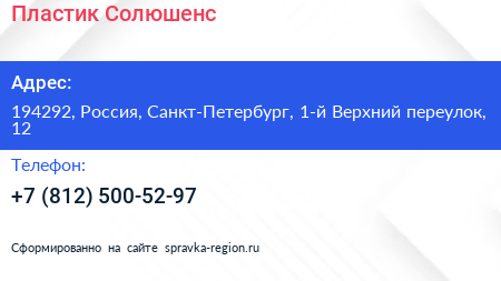 Пластик Солюшенс по адресу 194292, Россия, Санкт-Петербург, 1-й Верхний переулок, 12 в дальнейшем Организация, размещена в следующих категориях: