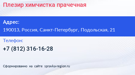Плезир, химчистка-прачечная по адресу 190013, Россия, Санкт-Петербург, Подольская, 21 в дальнейшем Организация, размещена в следующих категориях: