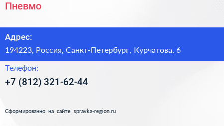 Пневмо по адресу 194223, Россия, Санкт-Петербург, Курчатова, 6 в дальнейшем Организация, размещена в следующих категориях:
