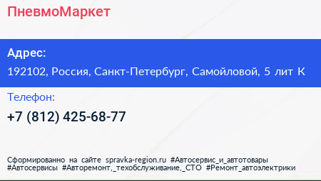 ПневмоМаркет по адресу 192102, Россия, Санкт-Петербург, Самойловой, 5 лит К в дальнейшем Организация, размещена в следующих категориях: