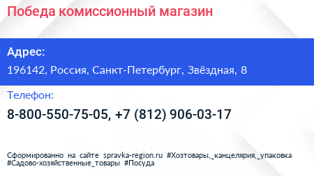 Победа, комиссионный магазин по адресу 196142, Россия, Санкт-Петербург, Звёздная, 8 в дальнейшем Организация, размещена в следующих категориях: