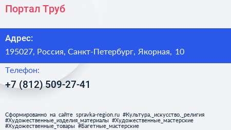 Портал Труб по адресу 195027, Россия, Санкт-Петербург, Якорная, 10 в дальнейшем Организация, размещена в следующих категориях: