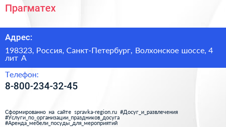 Прагматех по адресу 198323, Россия, Санкт-Петербург, Волхонское шоссе, 4 лит А в дальнейшем Организация, размещена в следующих категориях: