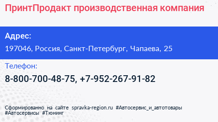 ПринтПродакт, производственная компания по адресу 197046, Россия, Санкт-Петербург, Чапаева, 25 в дальнейшем Организация, размещена в следующих категориях: