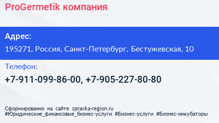 ProGermetik, компания по адресу 195271, Россия, Санкт-Петербург, Бестужевская, 10 в дальнейшем Организация, размещена в следующих категориях: