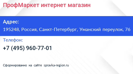 ПрофМаркет, интернет-магазин по адресу 195248, Россия, Санкт-Петербург, Уманский переулок, 76 в дальнейшем Организация, размещена в следующих категориях: