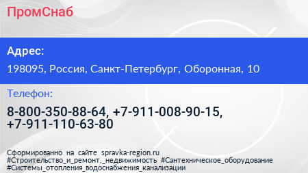 ПромСнаб по адресу 198095, Россия, Санкт-Петербург, Оборонная, 10 в дальнейшем Организация, размещена в следующих категориях: