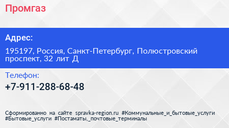 Промгаз по адресу 195197, Россия, Санкт-Петербург, Полюстровский проспект, 32 лит Д в дальнейшем Организация, размещена в следующих категориях: