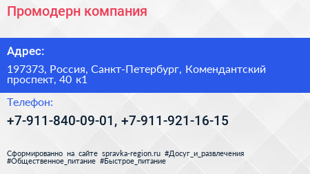 Промодерн, компания по адресу 197373, Россия, Санкт-Петербург, Комендантский проспект, 40 к1 в дальнейшем Организация, размещена в следующих категориях: