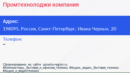 Промтехнолоджи, компания по адресу 198095, Россия, Санкт-Петербург, Ивана Черных, 20 в дальнейшем Организация, размещена в следующих категориях: