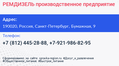 РЕМДИЗЕЛЬ, производственное предприятие по адресу 190020, Россия, Санкт-Петербург, Бумажная, 9 в дальнейшем Организация, размещена в следующих категориях: