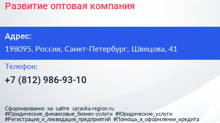 Развитие, оптовая компания по адресу 198095, Россия, Санкт-Петербург, Швецова, 41 в дальнейшем Организация, размещена в следующих категориях: