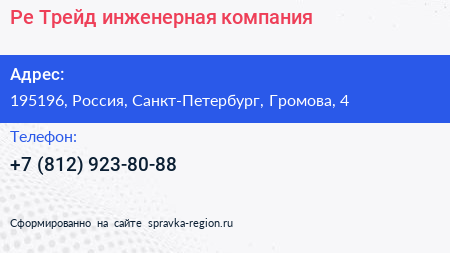 Ре Трейд, инженерная компания по адресу 195196, Россия, Санкт-Петербург, Громова, 4 в дальнейшем Организация, размещена в следующих категориях:
