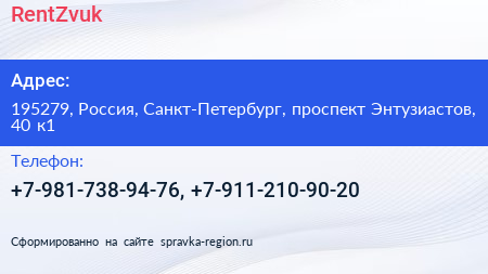 RentZvuk по адресу 195279, Россия, Санкт-Петербург, проспект Энтузиастов, 40 к1 в дальнейшем Организация, размещена в следующих категориях: