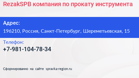 RezakSPB, компания по прокату инструмента по адресу 196210, Россия, Санкт-Петербург, Шереметьевская, 15 в дальнейшем Организация, размещена в следующих категориях: