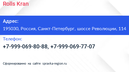Rolls-Kran по адресу 195030, Россия, Санкт-Петербург, шоссе Революции, 114 в дальнейшем Организация, размещена в следующих категориях: