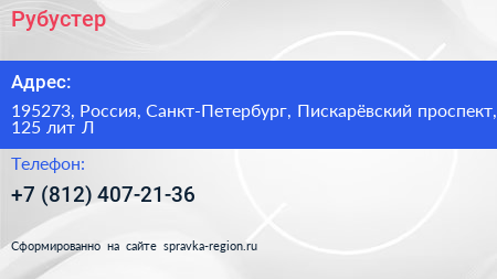 Рубустер по адресу 195273, Россия, Санкт-Петербург, Пискарёвский проспект, 125 лит Л в дальнейшем Организация, размещена в следующих категориях: