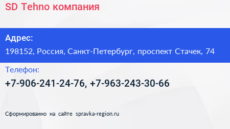 SD-Tehno, компания по адресу 198152, Россия, Санкт-Петербург, проспект Стачек, 74 в дальнейшем Организация, размещена в следующих категориях: