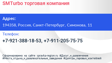 SMTurbo, торговая компания по адресу 194358, Россия, Санкт-Петербург, Симонова, 11 в дальнейшем Организация, размещена в следующих категориях: