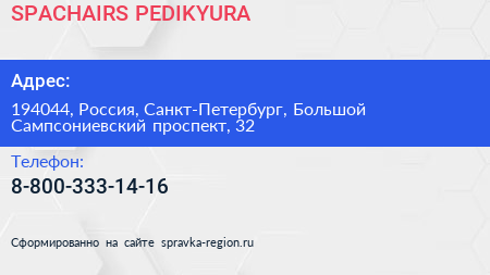 SPACHAIRS-PEDIKYURA по адресу 194044, Россия, Санкт-Петербург, Большой Сампсониевский проспект, 32 в дальнейшем Организация, размещена в следующих категориях:
