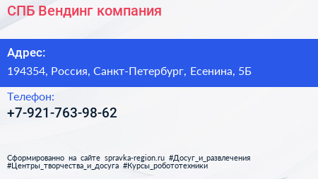 СПБ-Вендинг, компания по адресу 194354, Россия, Санкт-Петербург, Есенина, 5Б в дальнейшем Организация, размещена в следующих категориях: