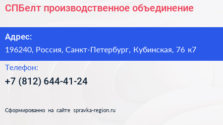 СПБелт, производственное объединение по адресу 196240, Россия, Санкт-Петербург, Кубинская, 76 к7 в дальнейшем Организация, размещена в следующих категориях: