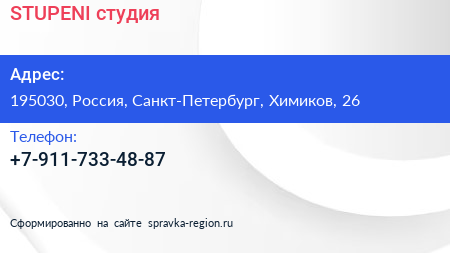 STUPENI, студия по адресу 195030, Россия, Санкт-Петербург, Химиков, 26 в дальнейшем Организация, размещена в следующих категориях: