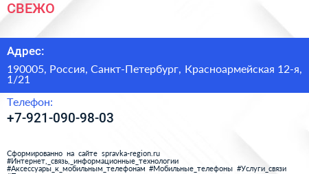 СВЕЖО по адресу 190005, Россия, Санкт-Петербург, Красноармейская 12-я, 1/21 в дальнейшем Организация, размещена в следующих категориях: