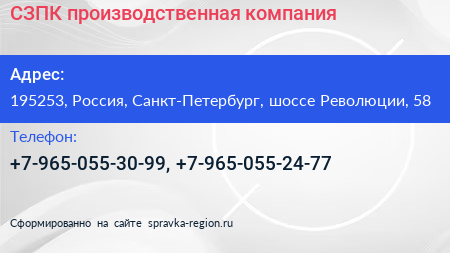 СЗПК, производственная компания по адресу 195253, Россия, Санкт-Петербург, шоссе Революции, 58 в дальнейшем Организация, размещена в следующих категориях: