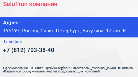 SaluTron, компания по адресу 195197, Россия, Санкт-Петербург, Ватутина, 17 лит К в дальнейшем Организация, размещена в следующих категориях: