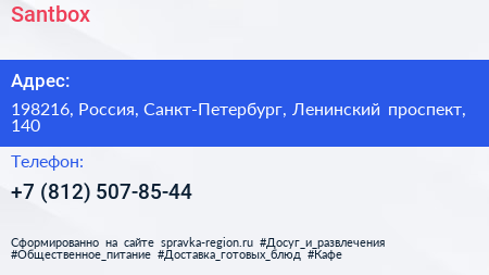 Santbox по адресу 198216, Россия, Санкт-Петербург, Ленинский проспект, 140 в дальнейшем Организация, размещена в следующих категориях:
