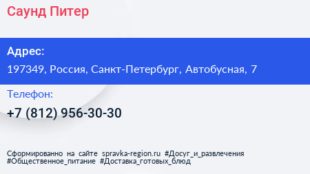 Саунд Питер по адресу 197349, Россия, Санкт-Петербург, Автобусная, 7 в дальнейшем Организация, размещена в следующих категориях: