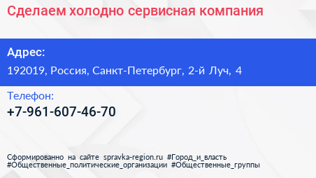 Сделаем холодно, сервисная компания по адресу 192019, Россия, Санкт-Петербург, 2-й Луч, 4 в дальнейшем Организация, размещена в следующих категориях: