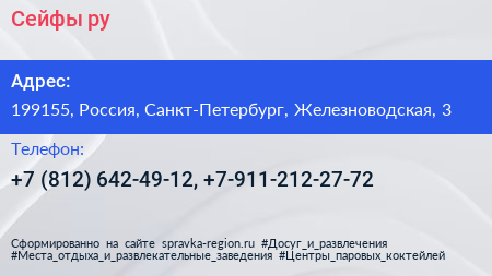 Сейфы.ру по адресу 199155, Россия, Санкт-Петербург, Железноводская, 3 в дальнейшем Организация, размещена в следующих категориях:
