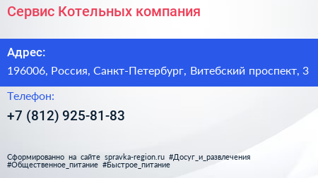 Для связи с организацией воспользуйтесь номером телефона: +7 (812) 925-81-83. Ежедневно с 00:00 до 24:00, вы можете обратиться в эту организацию.