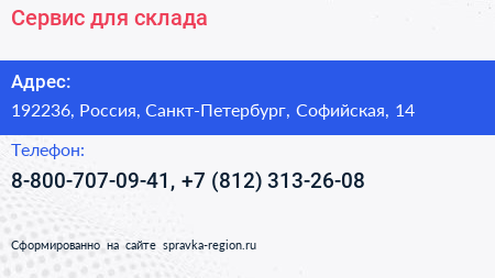Сервис для склада по адресу 192236, Россия, Санкт-Петербург, Софийская, 14 в дальнейшем Организация, размещена в следующих категориях: