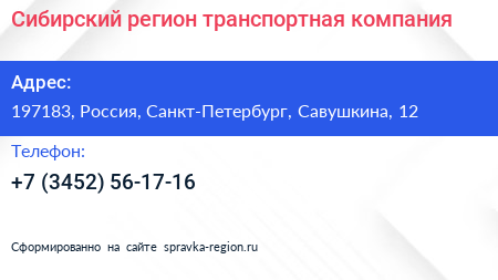 Сибирский регион, транспортная компания по адресу 197183, Россия, Санкт-Петербург, Савушкина, 12 в дальнейшем Организация, размещена в следующих категориях: