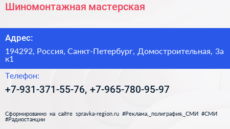 Шиномонтажная мастерская по адресу 194292, Россия, Санкт-Петербург, Домостроительная, 3а к1 в дальнейшем Организация, размещена в следующих категориях: